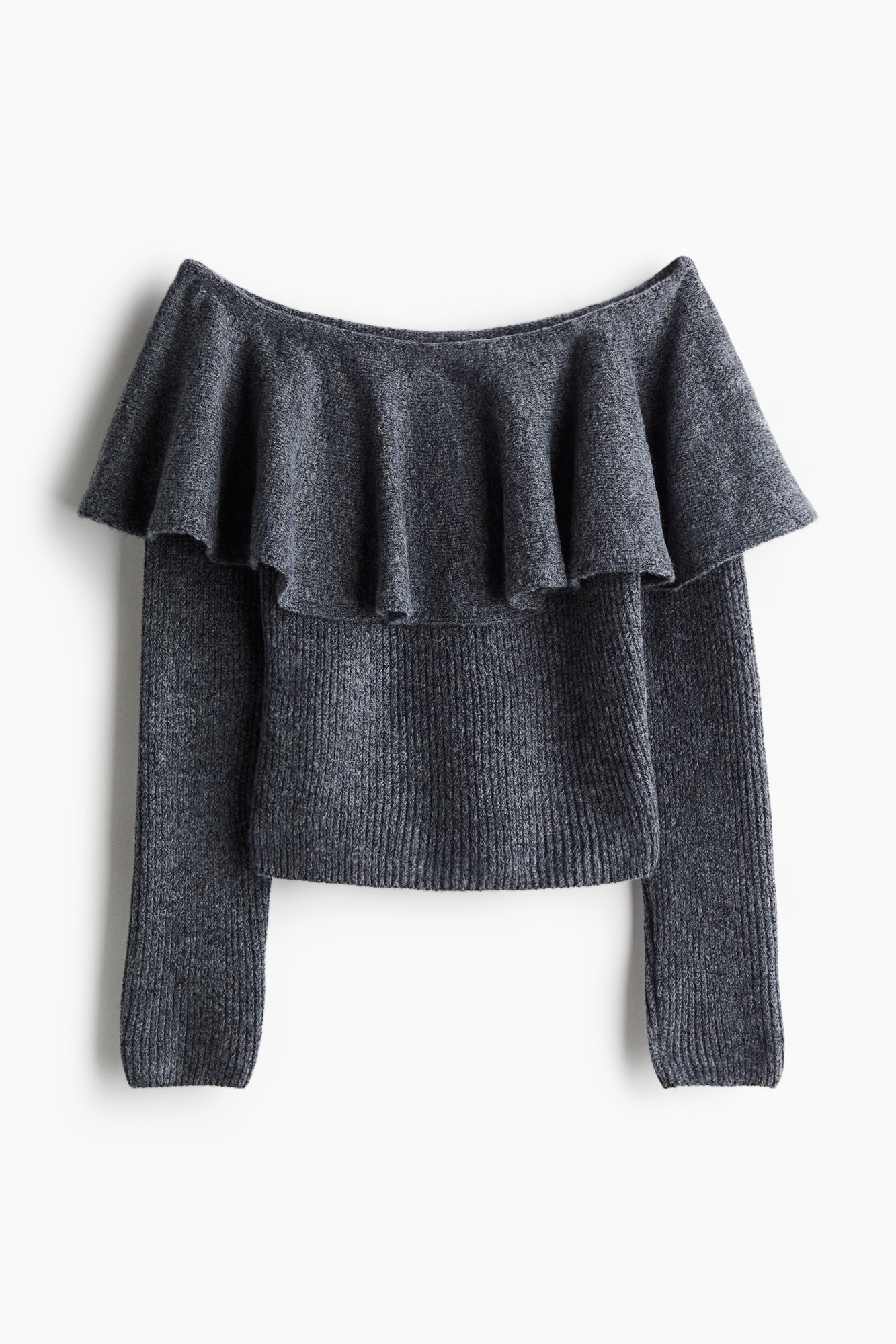 Короткий, приталенный джемпер без плеч из трикотажа в рубчик с длинными рукавами и широким воланом в верхней части.