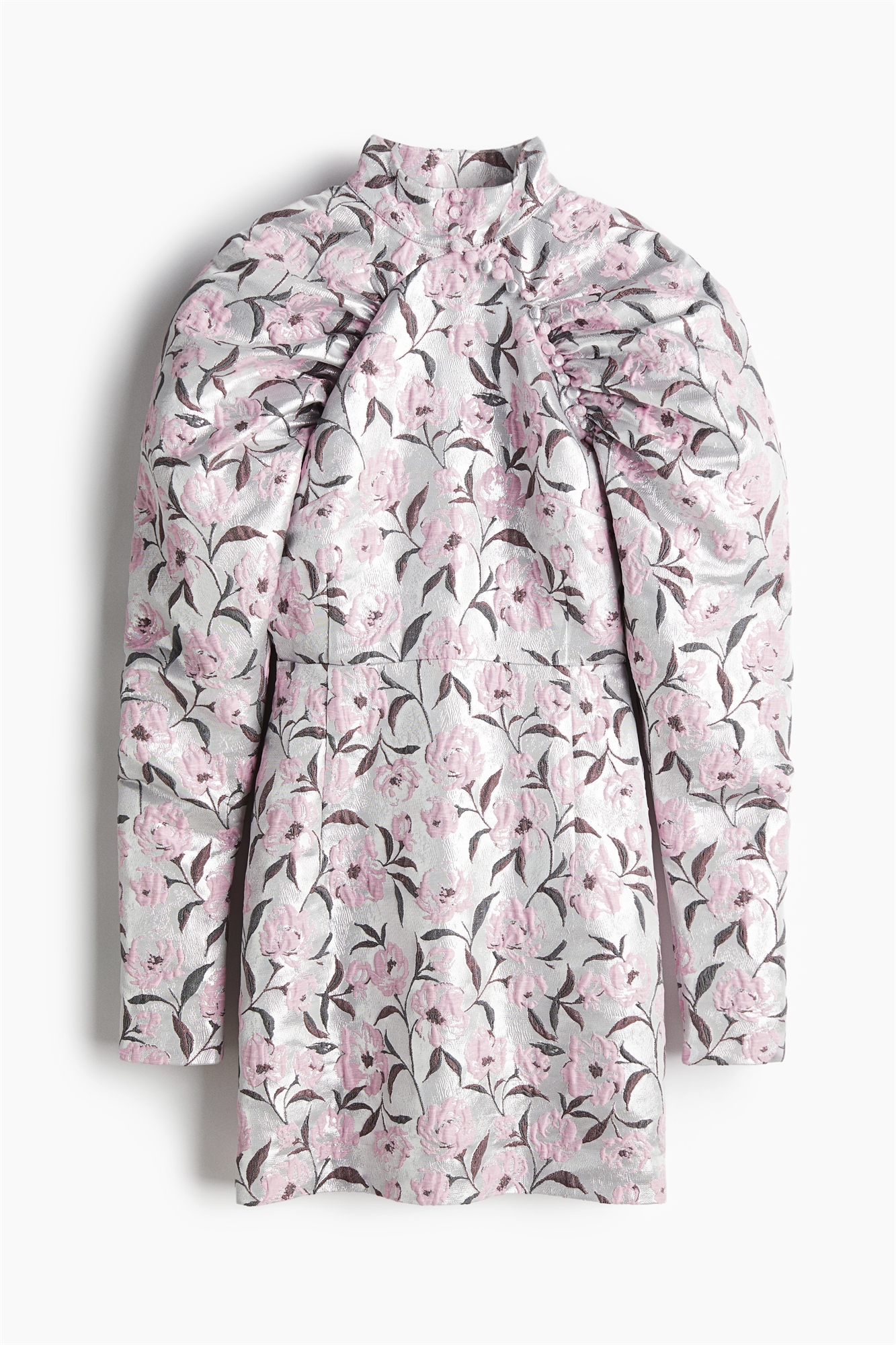 ROTATE H&M. Облегающее фигуру мини-платье из прочной парчи с замысловатыми цветочными узорами и мерцающей металлической основой. Длинные рукава реглан со сборками на груди и лопатках для придания объема плечам. Воротник-стойка и зауженная талия. Аккуратные пуговицы сзади на воротнике и манжетах, а также соответствующие декоративные пуговицы вдоль одного нагрудного шва. Скрытая застежка-крючок и молния сзади с логотипом бренда. На подкладке.