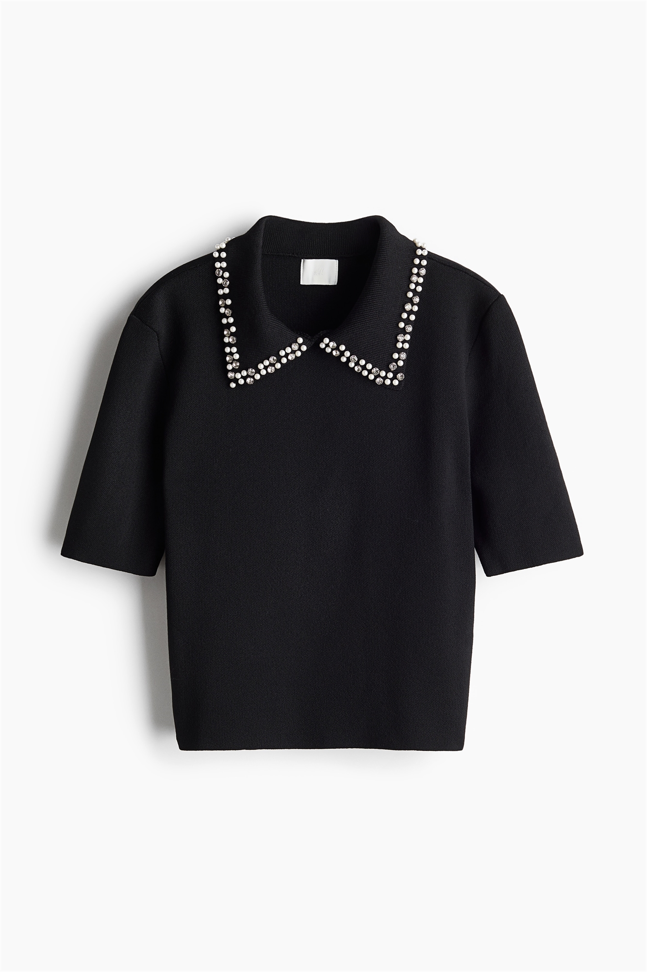 Короткий приталенный топ из плотного трикотажа с воротником, украшенным бисером и стразами. Рукава длиной до локтя и прямой подол.