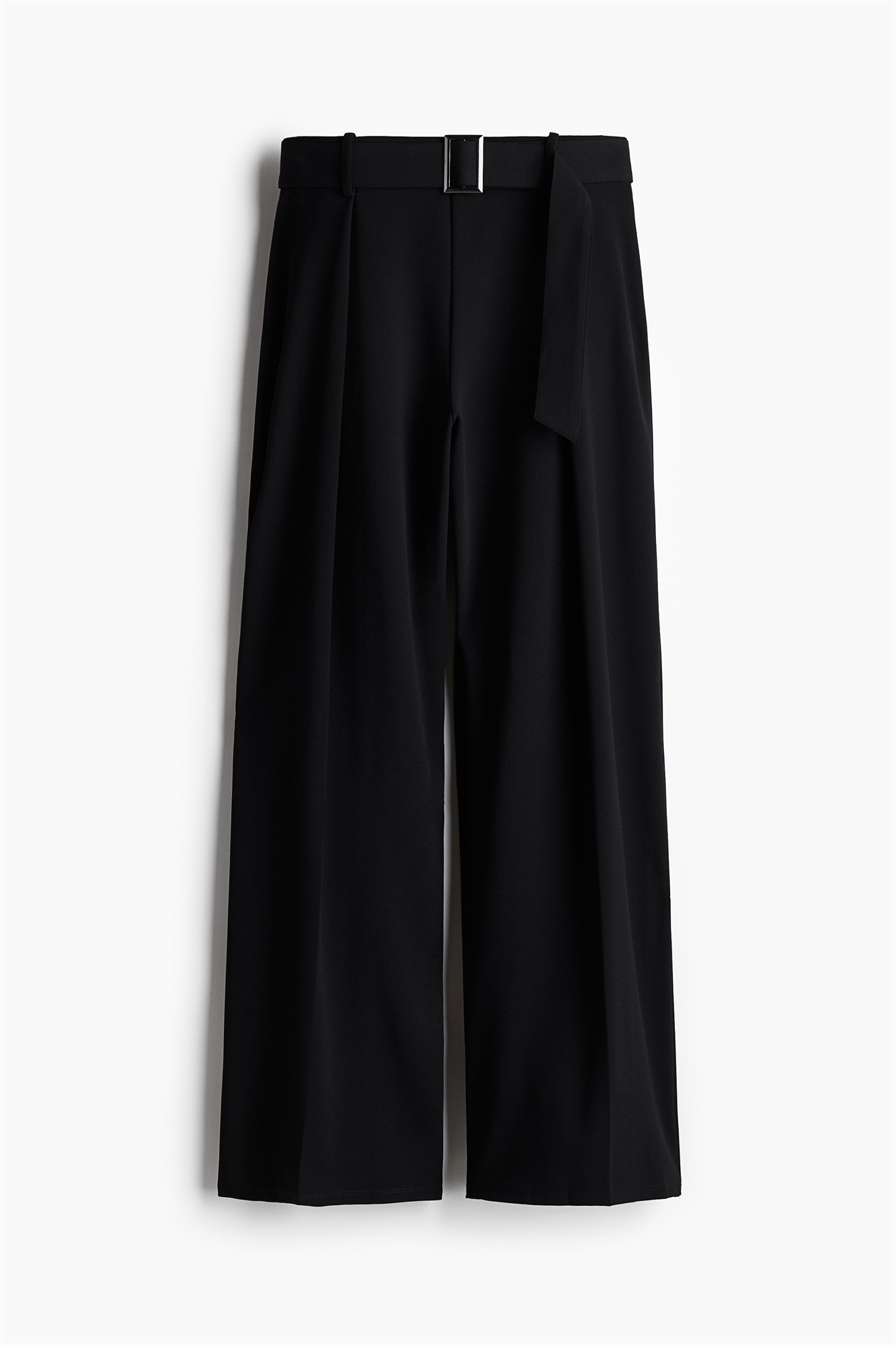 Свободные брюки из плотного трикотажного крепа с высокой талией со скрытой резинкой, вытачками сзади и пришитым поясом с прямоугольной пряжкой. Широкие ноги со складками спереди.