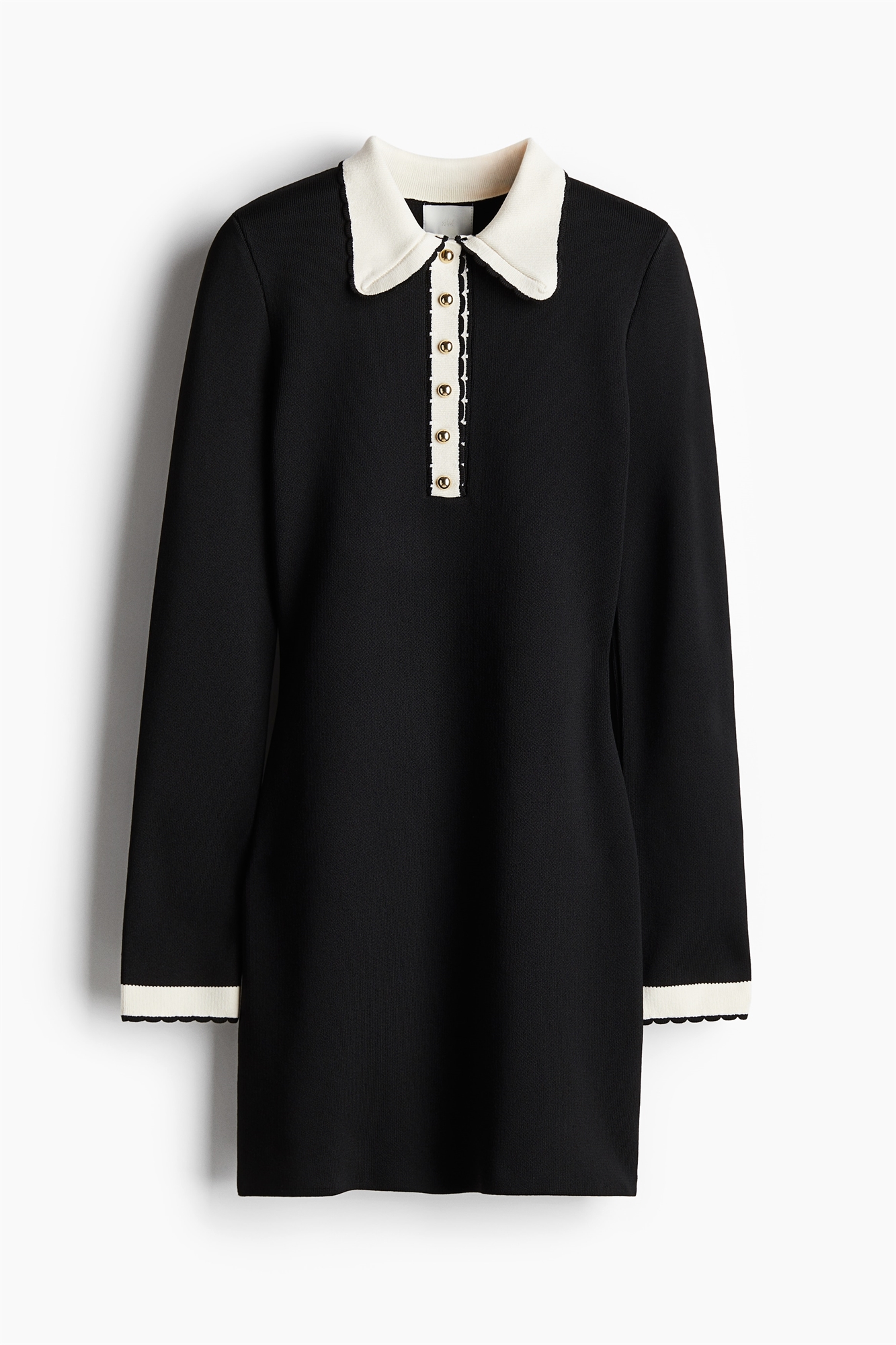 Короткое приталенное платье из плотного трикотажа с акцентными цветными деталями. Воротник, сферические металлические пуговицы в верхней части и длинные рукава. Окантовка воротника и манжет.