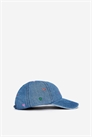 Джинсовая кепка в стиле бейсбола с вышитыми деталями. Застежка с металлической пряжкой и регулируемым ремешком сзади.