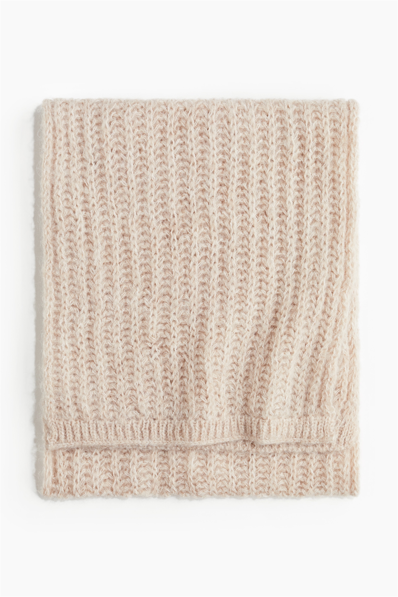 Шарф из мягкого трикотажа в рубчик с узкими завязками по коротким сторонам.