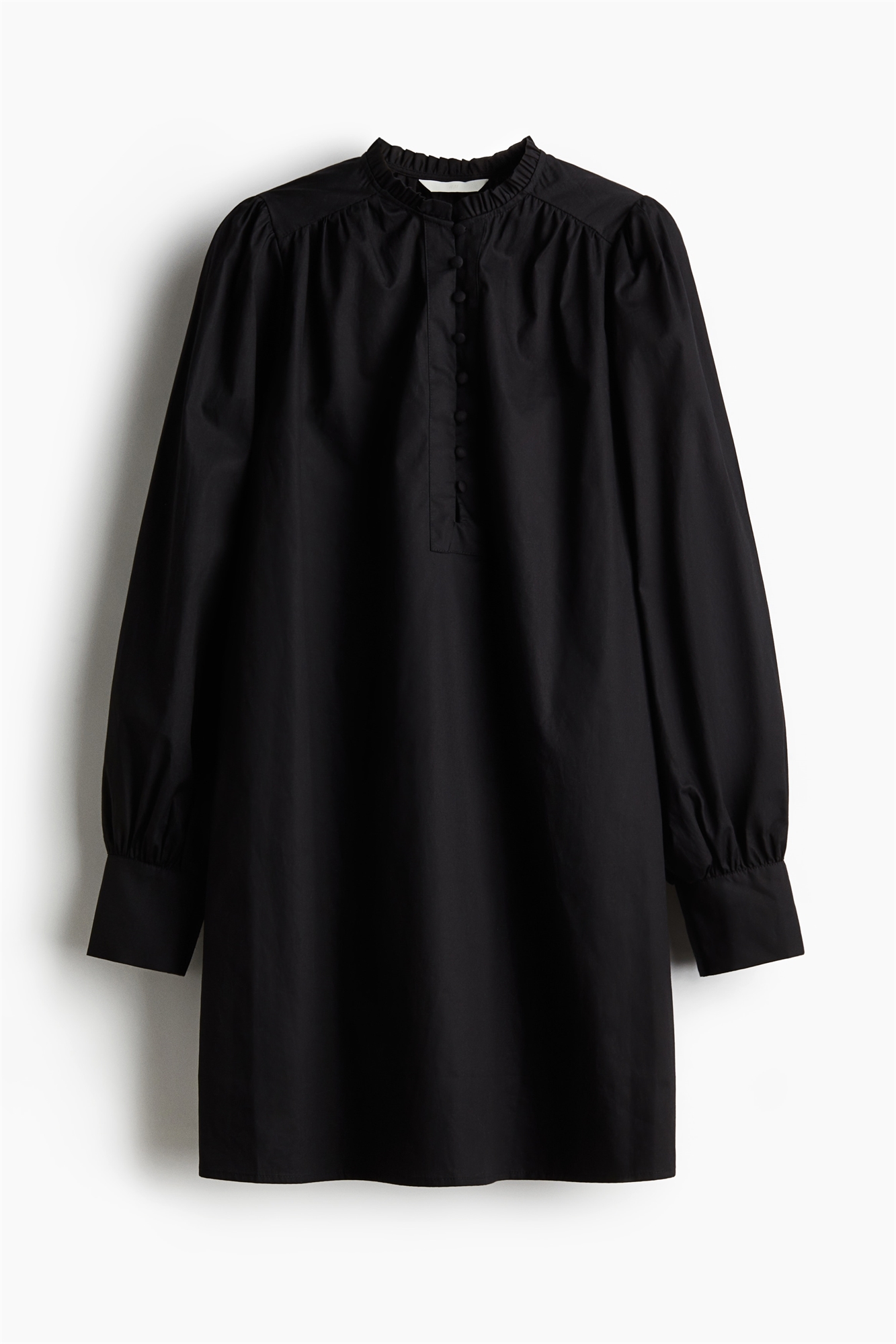 Короткое платье А-линии из воздушного хлопкового полотна с оборчатым воротником и закрытыми пуговицами спереди. Сборки на плечах и сзади на шее, длинные рукава-баллоны и широкие манжеты с закрытой пуговицей. Без подкладки.
