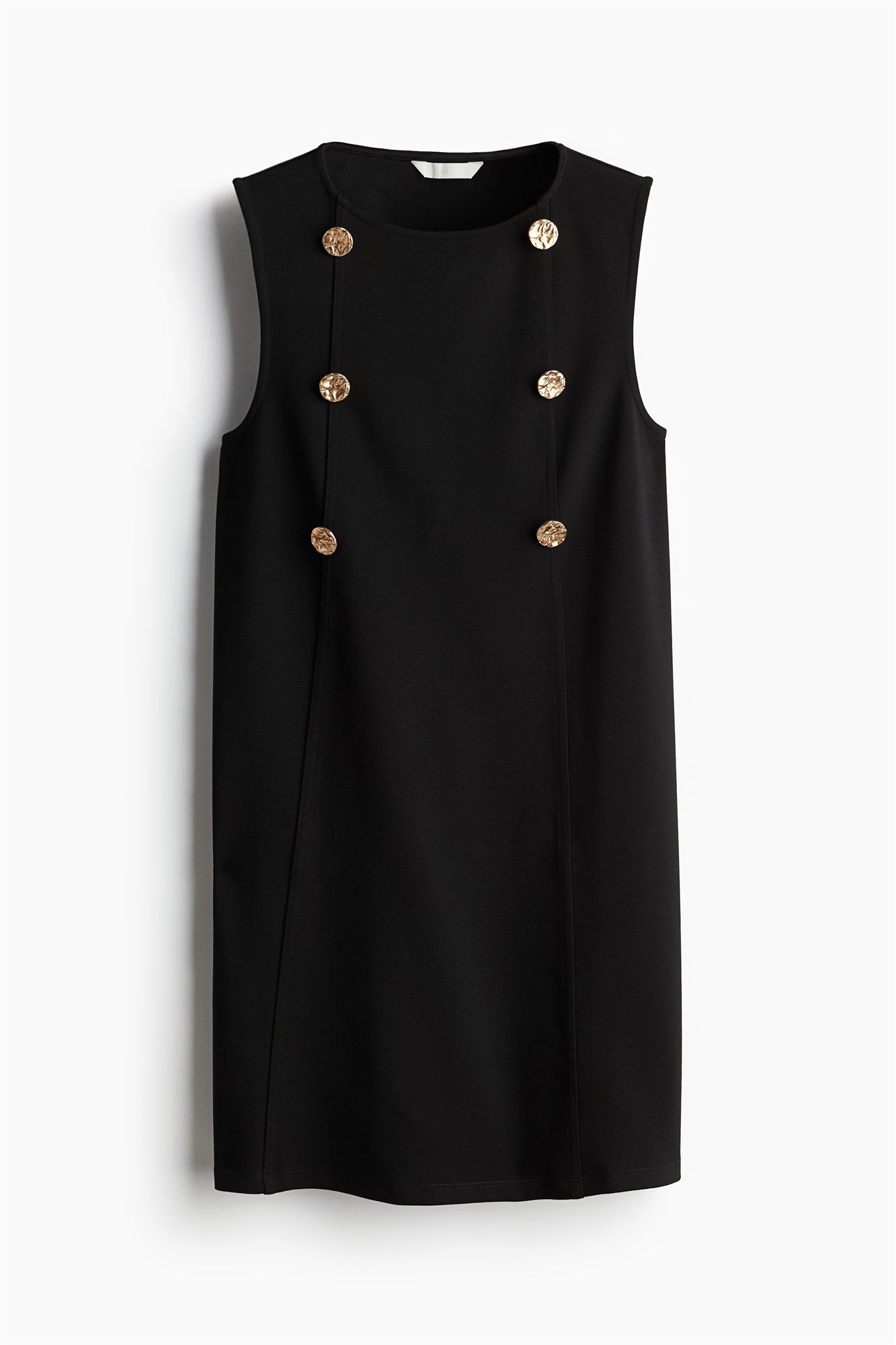 Короткое платье без рукавов из плотного трикотажа с круглым вырезом и декоративными пуговицами золотого цвета спереди.