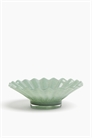Большая декоративная чаша из стекла в виде веера. Поскольку чаша изготовлена вручную, каждое изделие может отличаться по форме и цвету. Высота 9 см. Ширина 24 см. Длина 27 см.