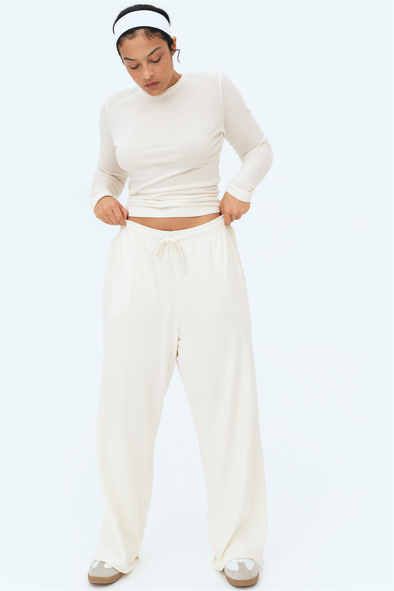 Свободные треники из легкой хлопковой ткани с потертостями. Эластичная вставка и шнурок на талии, неброские боковые карманы и прямые ноги с необработанными краями.