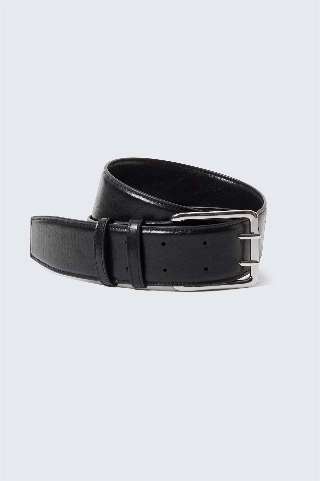 Гладкий, слегка мягкий ремень из искусственной кожи, изготовленный из переработанного полиэстера. Он оснащен металлической пряжкой с двойными зубцами и 2 рядами из 7 насечек.