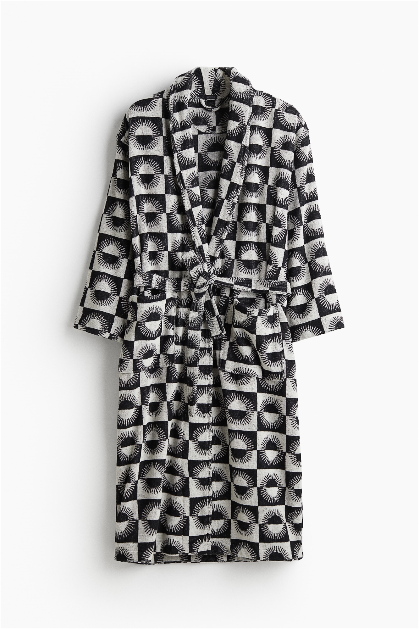 Халат из мягкой хлопковой махры с двухцветным рисунком, вдохновленным солнцем, заходящим за океанский горизонт. Шалевый воротник, передние карманы и съемный пояс-завязка на талии.