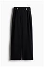 Свободные приталенные брюки из джерси-крэпа с высокой талией со скрытой резинкой, вытачками сзади и декоративной вкладкой с металлической пуговицей с каждой стороны. Широкие ноги со складками спереди для легкой драпировки.