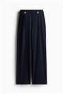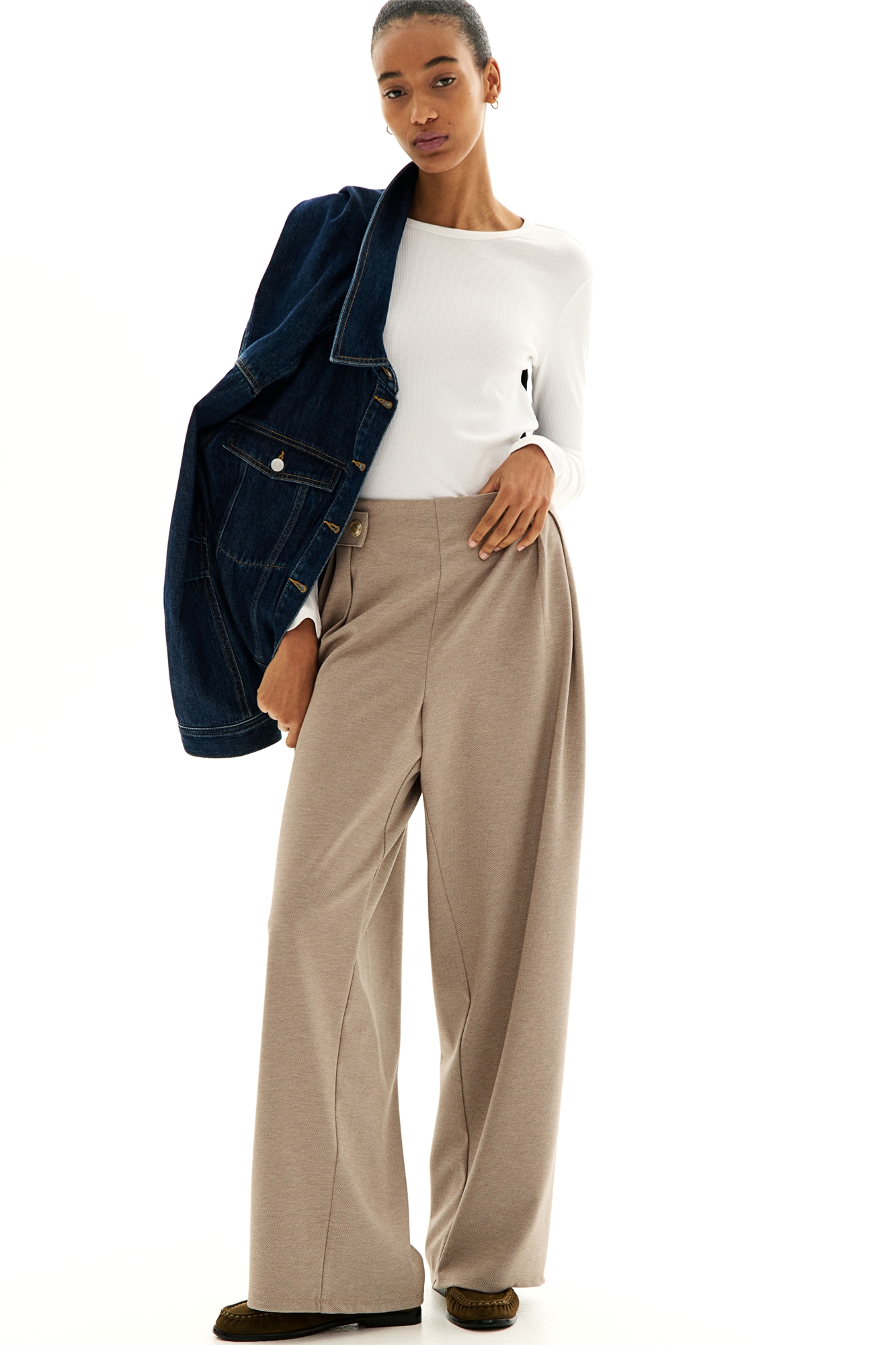 Свободные приталенные брюки из джерси-крэпа с высокой талией со скрытой резинкой, вытачками сзади и декоративной вкладкой с металлической пуговицей с каждой стороны. Широкие ноги со складками спереди для легкой драпировки.