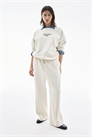 Джоггеры свободного кроя из легкого хлопкового свитшота. Эластичный пояс с завязками, незаметные боковые карманы и прямые ноги с застроченными складками спереди и сзади.