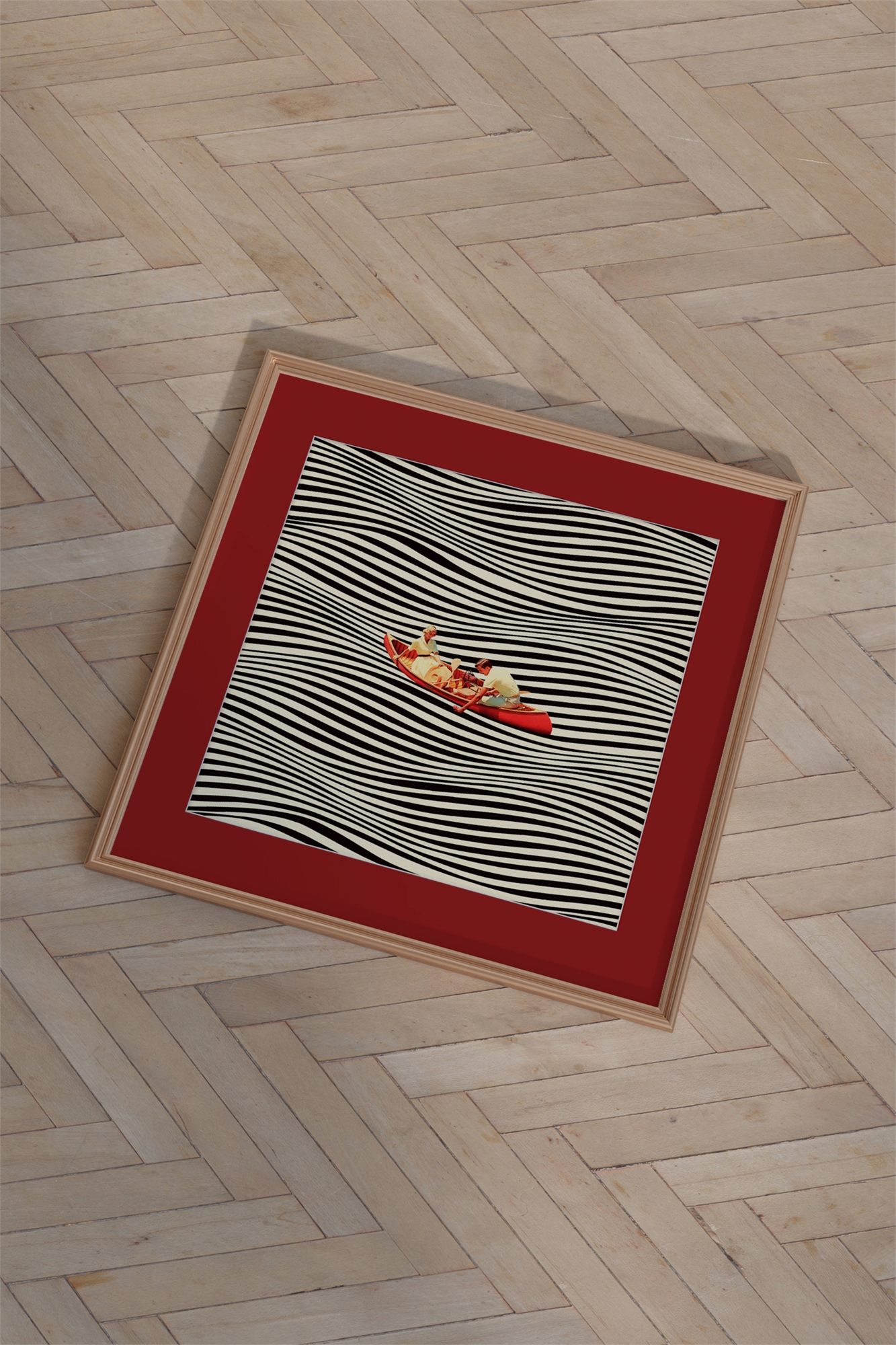 Погрузитесь в мир оптических иллюзий с этим завораживающим постером. Каноэ скользит по гипнотическим черно-белым волнам, создавая завораживающий визуальный опыт, стирающий грань между реальностью и фантазией. Постер оформлен в красную паспарту в дубовой раме с акриловым стеклом.
