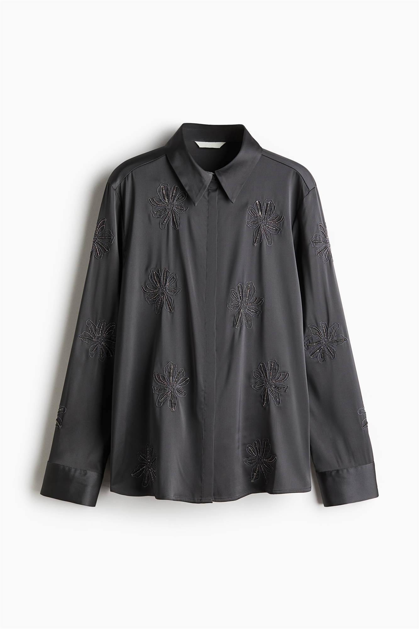 Рубашка из тканого материала с легким блеском, украшенная вышитыми бисером и пайетками цветами. Свободный крой, отложной воротник, потайные пуговицы спереди и длинные рукава с манжетами на пуговицах.