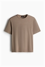 Футболка из ребристого трикотажа средней плотности с круглым вырезом и прямым покроем. Зауженный крой, который облегает контуры тела, создавая приталенный силуэт.