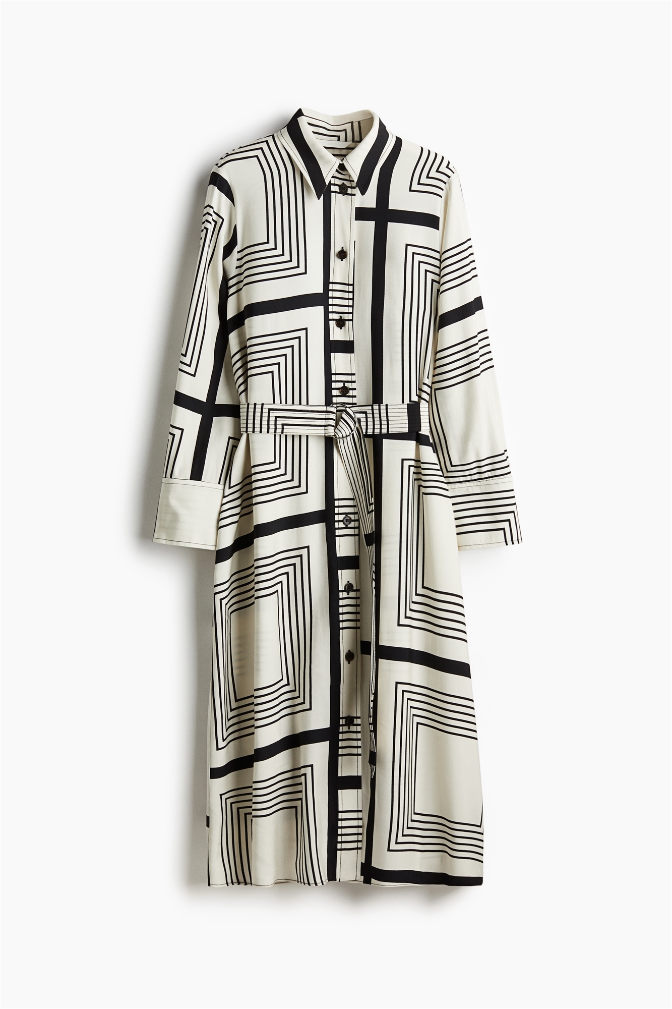 Платье длиной до колен из саржи с воротником и пуговицами спереди. Двухслойная стойка сзади, длинные рукава с манжетами на пуговицах и рукавной планкой с пуговицей. Съемный пояс с D-кольцами. Без подкладки.