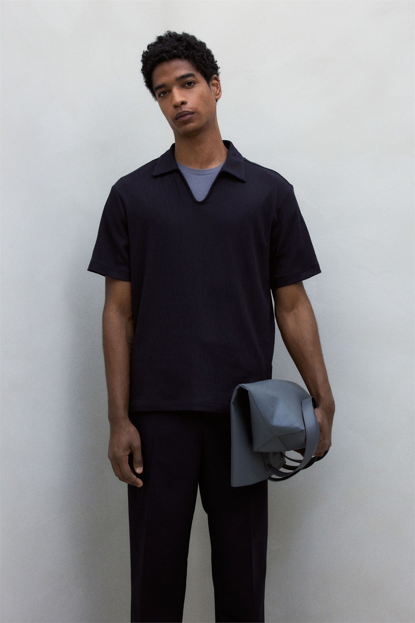 Футболка из фактурного джерси из хлопкового микса с воротником и небольшим V-образным разрезом в верхней части. Регулярный крой для комфортной носки и классического силуэта.