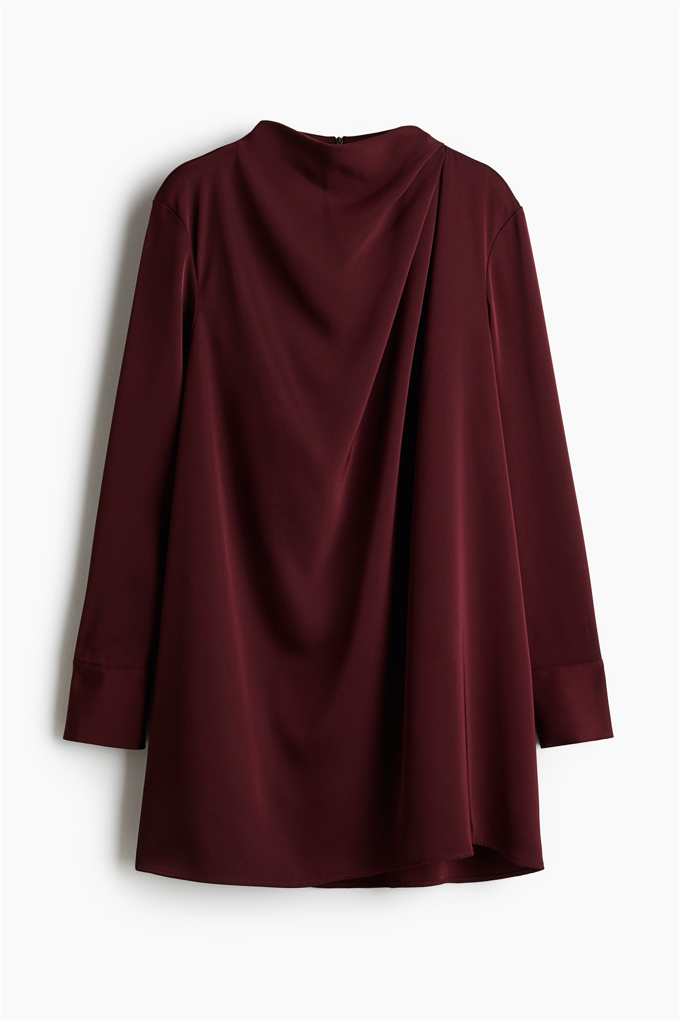 Короткое платье из мягкой саржи с небольшой черепаховой горловиной и складками на одном плече для легкой драпировки спереди. Свободный крой, слегка спущенные плечи и длинные рукава-баллон с разрезом и пуговицей на манжетах. Скрытая молния и застежка-крючок сзади. Без подкладки.