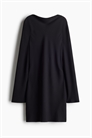 Короткое приталенное платье из мягко драпирующегося переплетения с блеском. Изящный вырез-лодочка и глубокий вырез на спине с декоративным бантом. Длинные рукава и прямой подол. Без подкладки.