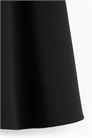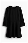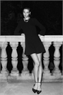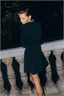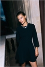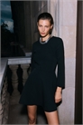 Короткое платье из саржи с круглым вырезом, потайной застежкой на молнию и крючком сзади. Рукава длиной 3/4, нагрудные вытачки, шов на талии и расклешенная юбка. Без подкладки.