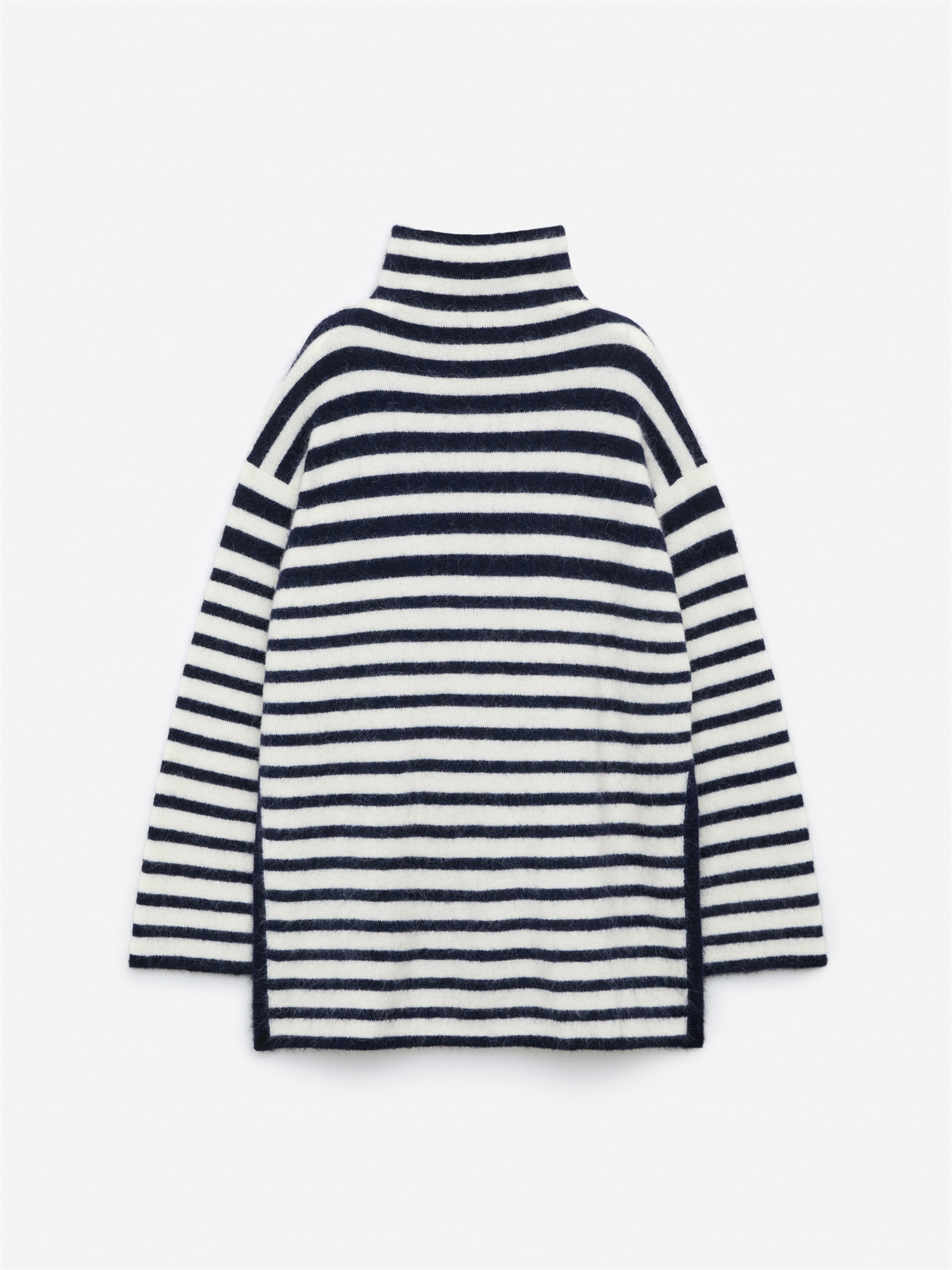 Джемпер с вырезом под горло из смеси шерсти и альпаки. Удлиненный фасон с разрезами по обеим сторонам. Расслабленный крой. Этот фасон содержит 28% альпаки RAS и 32% шерсти RWS (TE-00047206). Продукция, сертифицированная по стандартам Responsible Wool Standard (RWS) и Responsible Alpaca Standard (RAS), содержит шерсть и волокно альпака с ферм, прошедших независимую сертификацию на соответствие требованиям по благополучию животных и землепользованию.