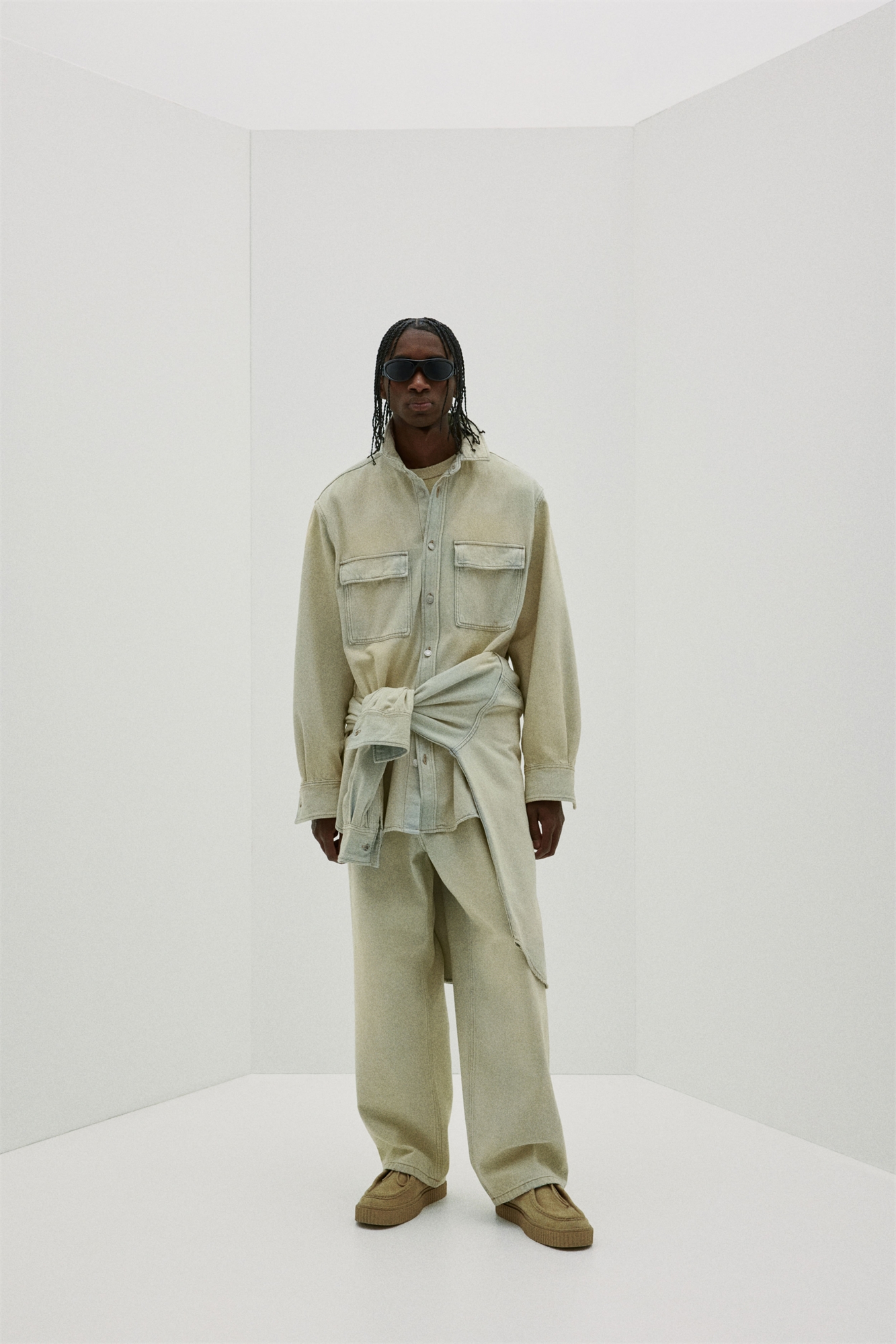 Рубашка из жесткого хлопкового денима с отложным воротником, классическим передом с металлическими пуговицами, передом и накладными нагрудными карманами с потайными кнопками. Длинные рукава с манжетами на пуговицах и рукавной планкой. Закругленный подол. Посадка оверсайз для придания мешковатого, свободного силуэта.