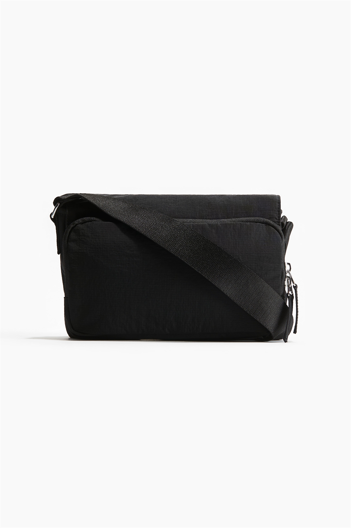 Сумка кроссбоди из нейлона с клапаном со скрытыми кнопками и внешним отделением на молнии. Регулируемый плечевой ремень с застежкой-скобой. Два открытых внутренних отделения. Глубина 6 см. Высота 18 см. Ширина 24 см. На подкладке.