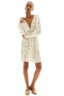 Короткое платье из трикотажа плиссе с глубоким V-образным вырезом и диагональными швами под бюстом. Длинные рукава-баллоны с эластичной отделкой и узкими завязками на манжетах. Юбка А-линии с необработанным подолом.