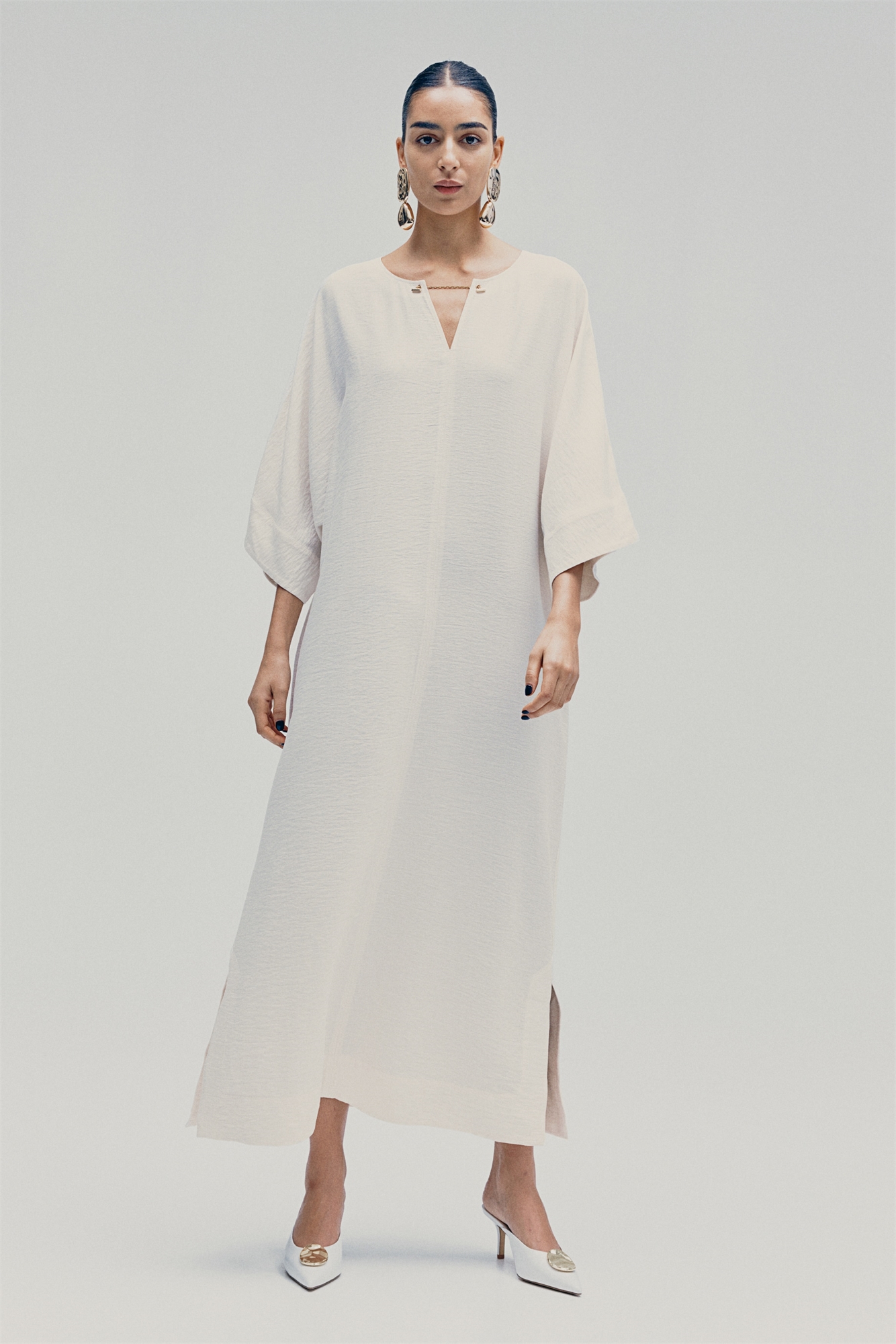 Длинное платье-кафтан свободного покроя из вискозного смесового крепа с круглым вырезом и V-образной проймой, украшенной металлической цепочкой. Рукава длиной до локтя и подол прямого кроя с высоким разрезом с каждой стороны. Без подкладки.
