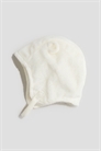 Чепчик из мягкого ворса на подкладке из джерси с аппликацией в виде ушей на макушке и вкладкой под подбородком с застежкой на крючок и петлю.