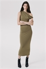 Приталенное платье длиной до колен из стрейч-джерси с асимметричным вырезом и перекрученной панелью на рукавах. Собирается на одном плече и сбоку, создавая эффект легкой драпировки.