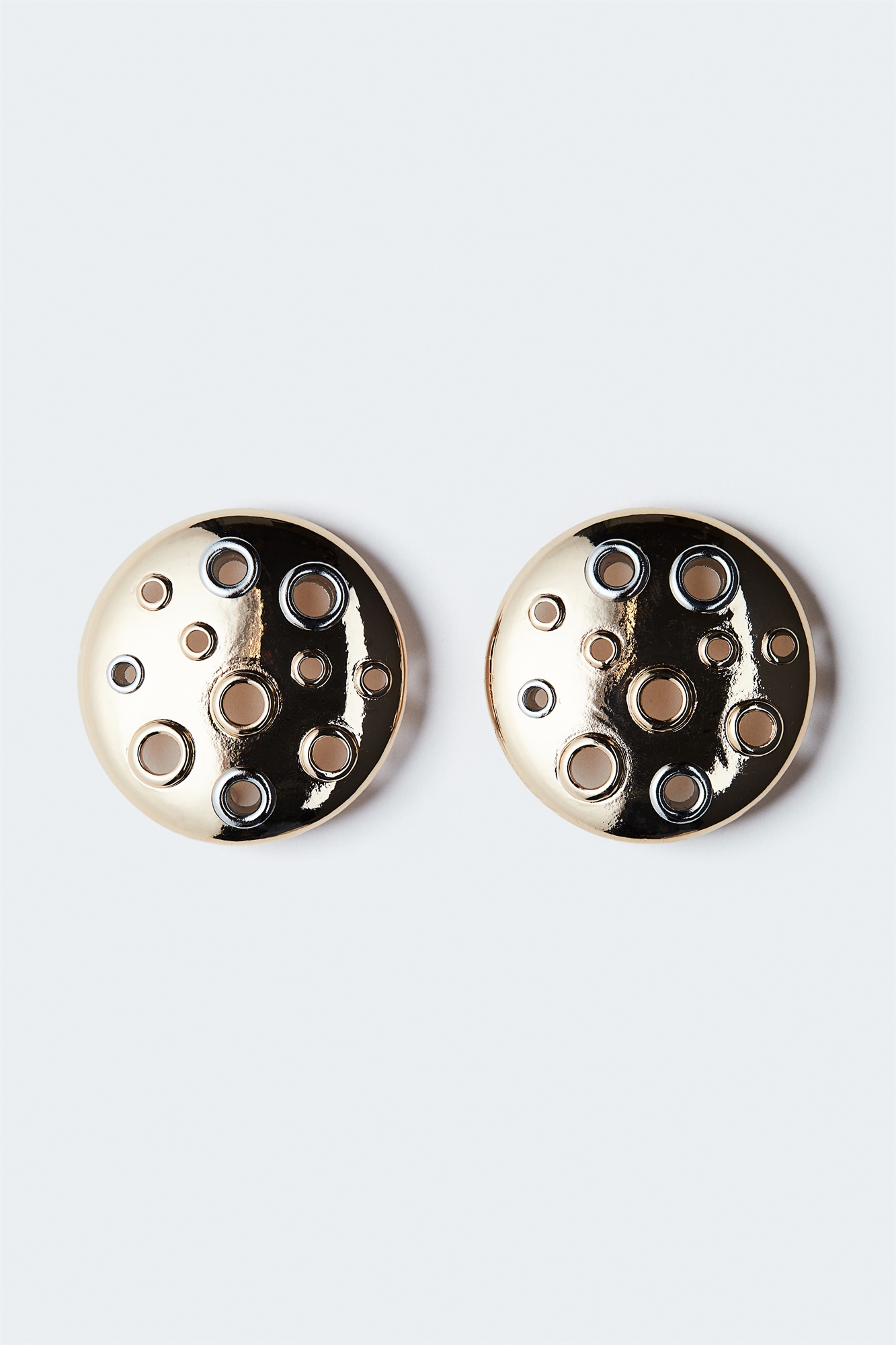Металлические серьги в форме диска, украшенные люверсами разных размеров.