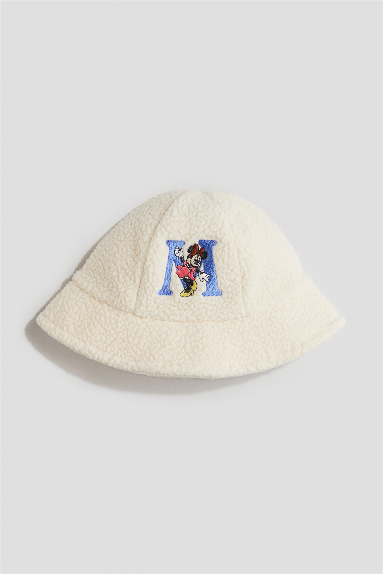 Шапка-ведро из мягкого плюша с вышивкой спереди и хлопковой накладкой.