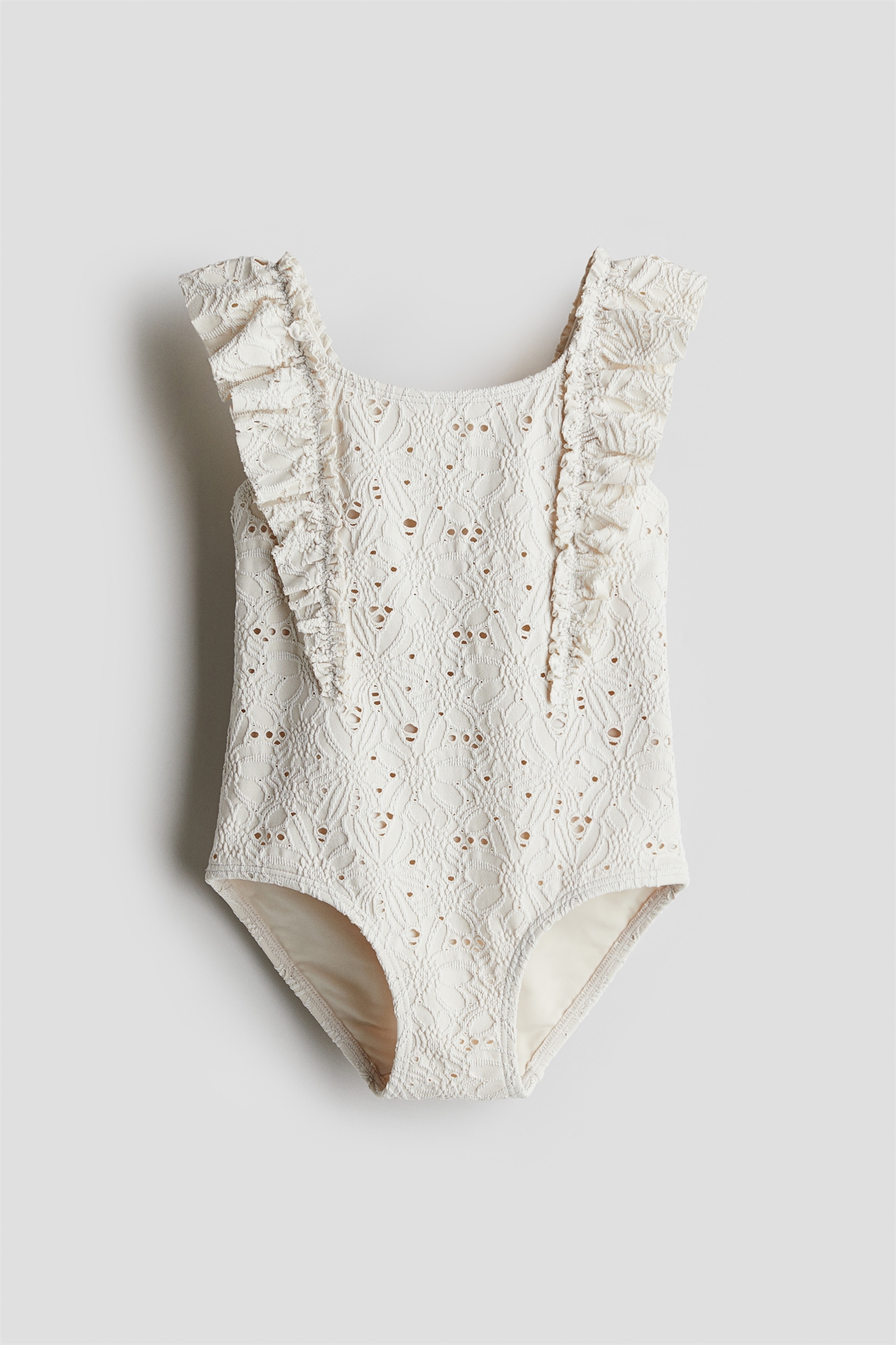 Фактурный купальник на подкладке с оборками спереди, которые переходят на плечи и спину.