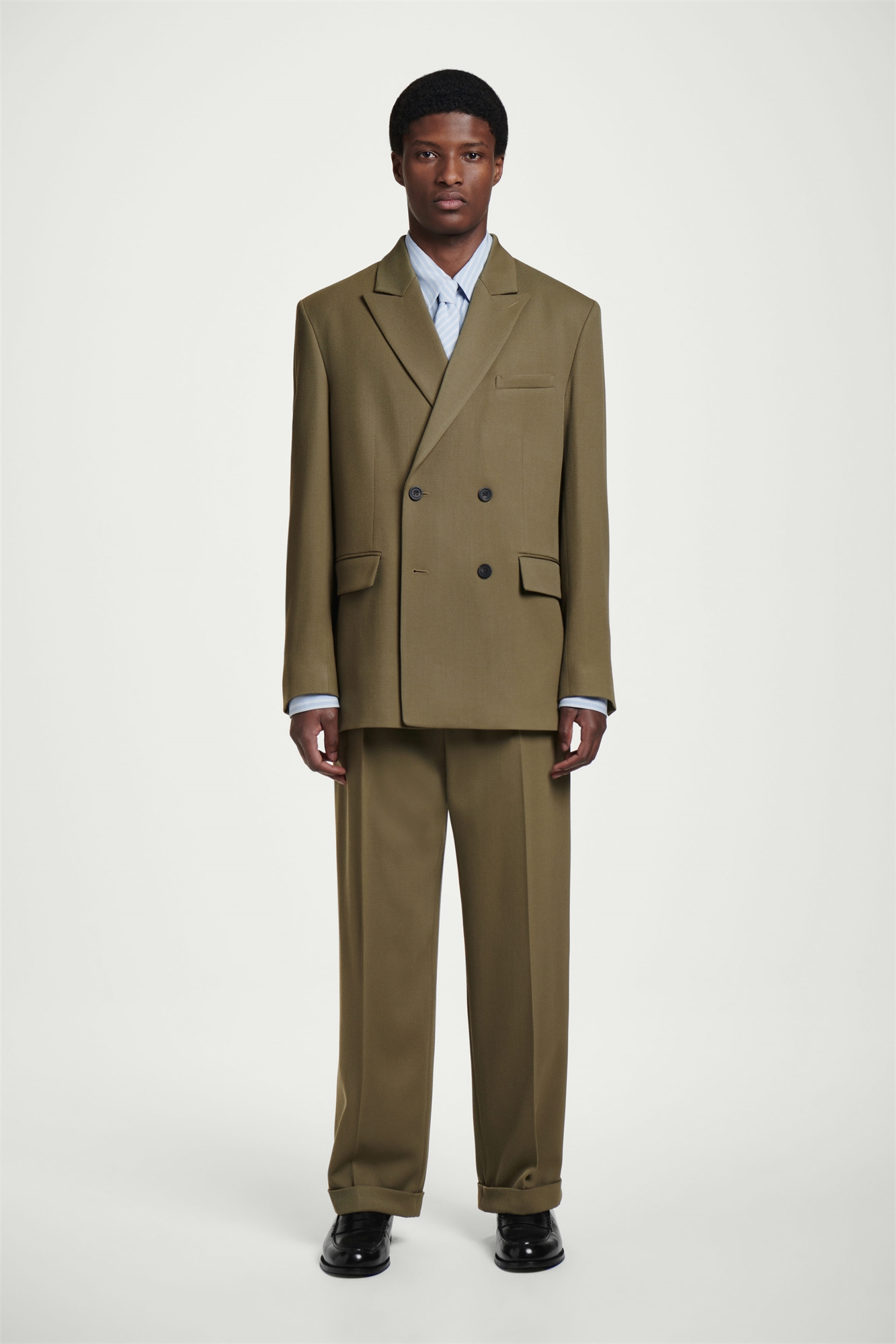 Эти современные брюки сшиты из шерстяной саржи и имеют просторные прямые ноги и подворачивающиеся края. Они имеют аккуратный пояс, складки спереди и внутреннюю регулируемую планку для индивидуальной посадки. Свободный крой Застежка на крючок и молнию Этот продукт содержит шерстяное волокно Responsible Wool Standard TE-00047206 (RWS) с ферм, сертифицированных в соответствии с требованиями по благополучию животных и землепользованию Оболочка: 59% шерсти RWS, 41% переработанного полиэстера. Подкладка карманов: 100% хлопок. Без учета отделки / Сухая чистка Внутренняя длина штанины размера EU 36 составляет 75,2 см / Модель носит размер EU 36