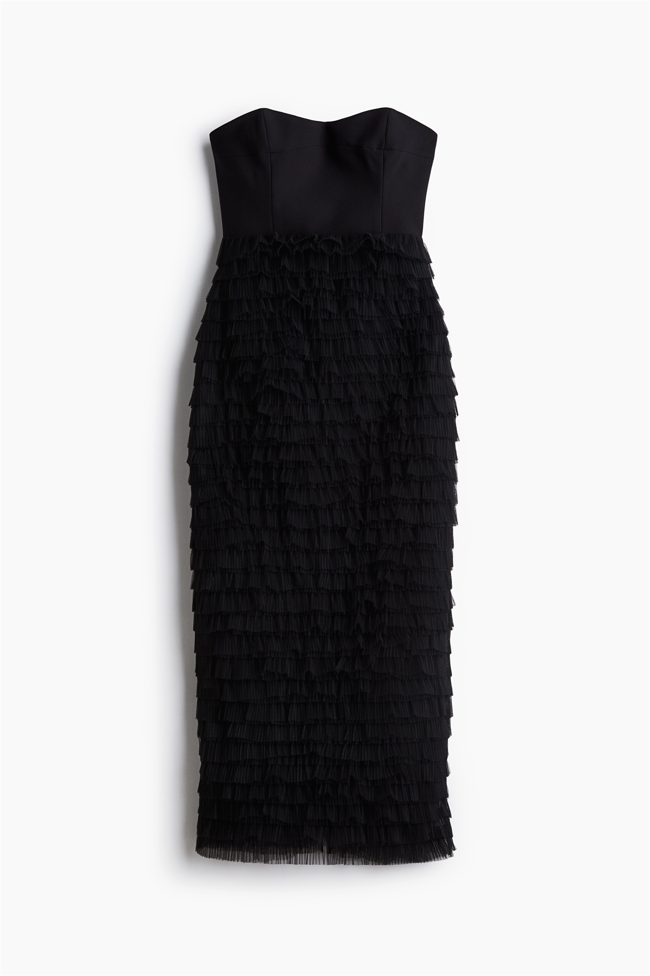 Приталенное платье длиной до колен с лифом из тканого материала, вырезом в форме сердца со скрытой силиконовой отделкой, косточками для придания формы и поддержки, а также скрытой застежкой-молнией и застежкой на крючки и глазки сзади. Юбка с многослойными горизонтальными оборками из плиссированного тюля, прямой подол и разрез сзади. Подкладка из джерси.