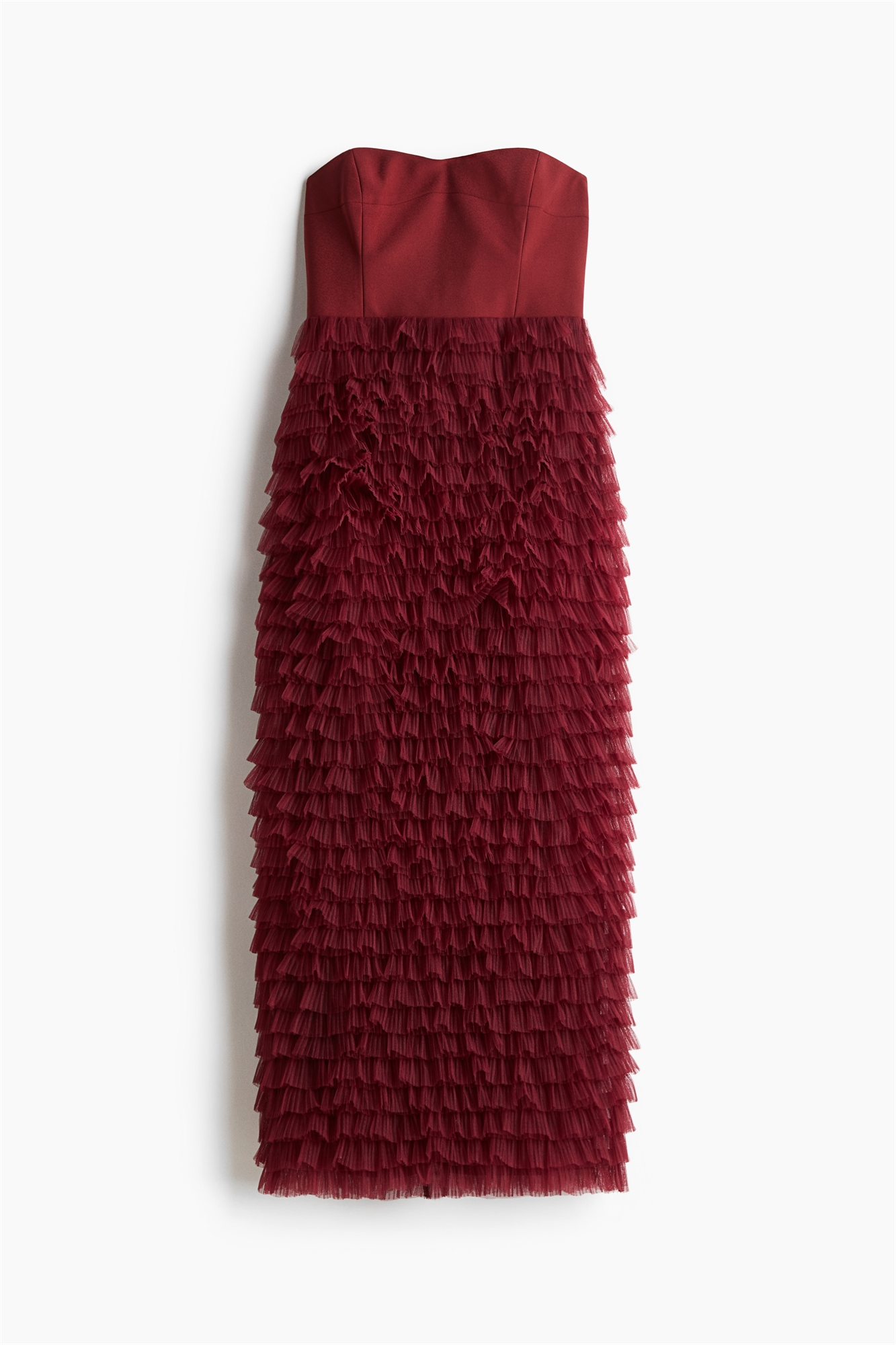 Приталенное платье длиной до колен с лифом из тканого материала, вырезом в форме сердца со скрытой силиконовой отделкой, косточками для придания формы и поддержки, а также скрытой застежкой-молнией и застежкой на крючки и глазки сзади. Юбка с многослойными горизонтальными оборками из плиссированного тюля, прямой подол и разрез сзади. Подкладка из джерси.
