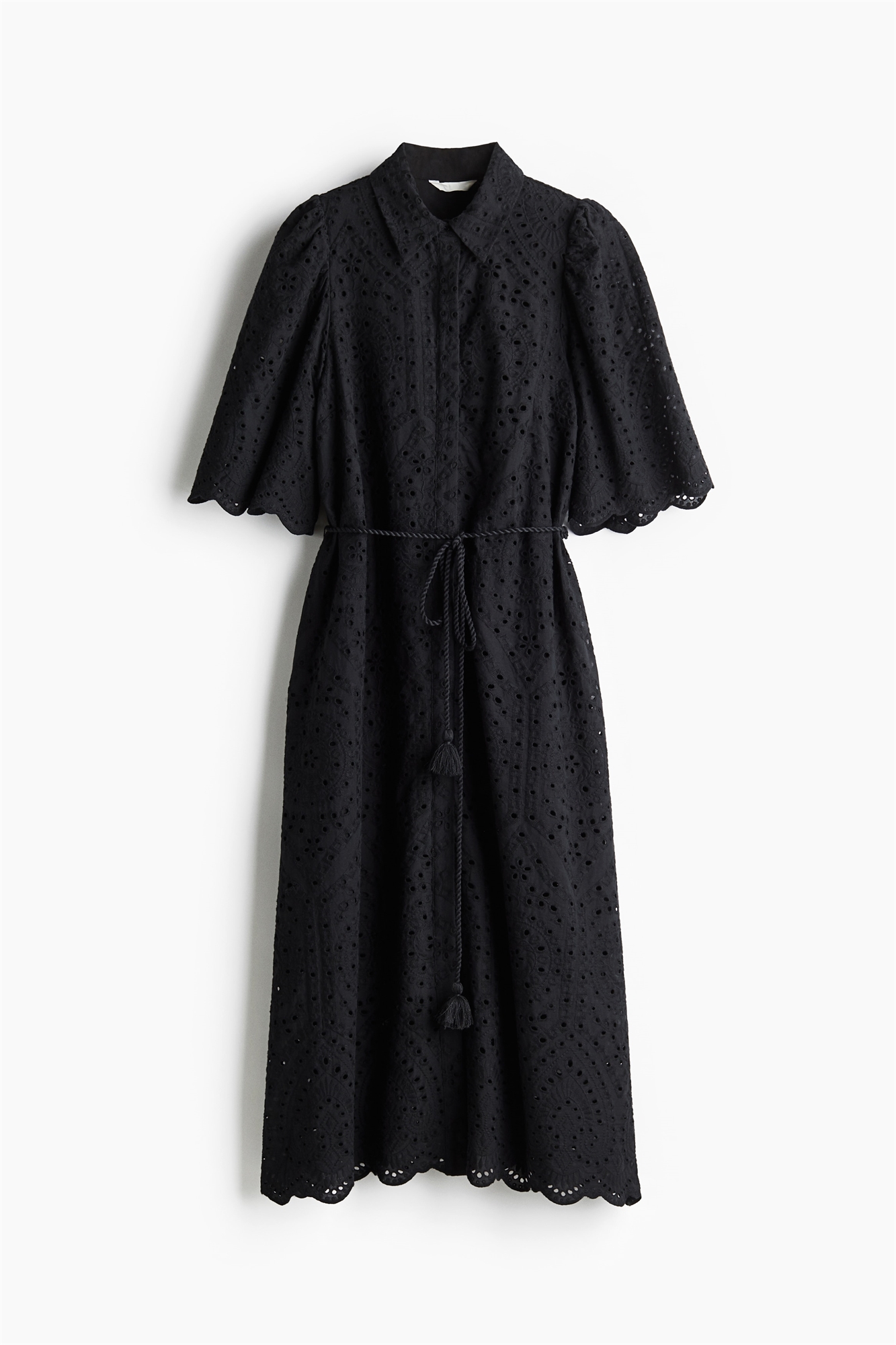 Платье-рубашка длиной до колена из воздушного хлопкового полотна с отделкой бродери англез. Воротник, потайные пуговицы спереди и пышные рукава длиной до локтя. Узкий пояс с кисточками на талии и обрезные края манжет и подола. На подкладке.