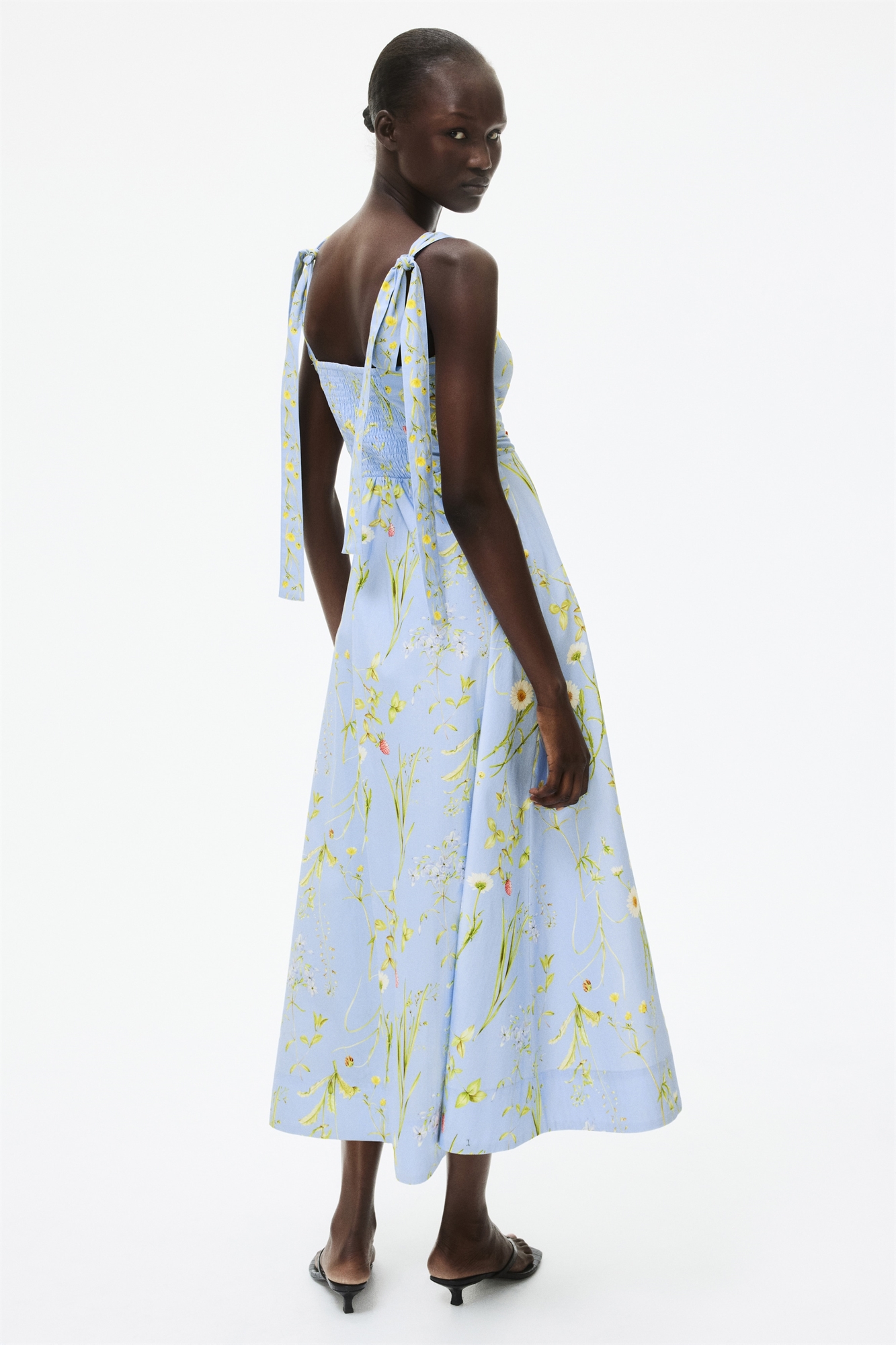 Платье длиной до колен из хлопкового полотна с завязками на плечах, квадратным вырезом и закрытыми пуговицами спереди. Приталенный лиф со швом сзади, шов на талии и расклешенная юбка. Без подкладки.