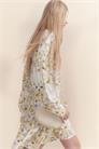 Короткое платье из вискозного полотна с узором по всей длине. Свободный крой с воротником-бантом, застежкой на пуговицы спереди и длинными рукавами-баллончиками с разрезом и пуговицей на манжетах. Юбка с расклешенным подолом.
