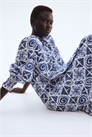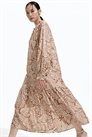 Свободное платье из тканого материала с оборчатым воротником-стойкой и V-образной проймой с завязками-спагетти в верхней части. Длинные рукава-баллон реглан с отделкой и оборкой на манжетах. Шов над коленями для придания объема. Без отделки.