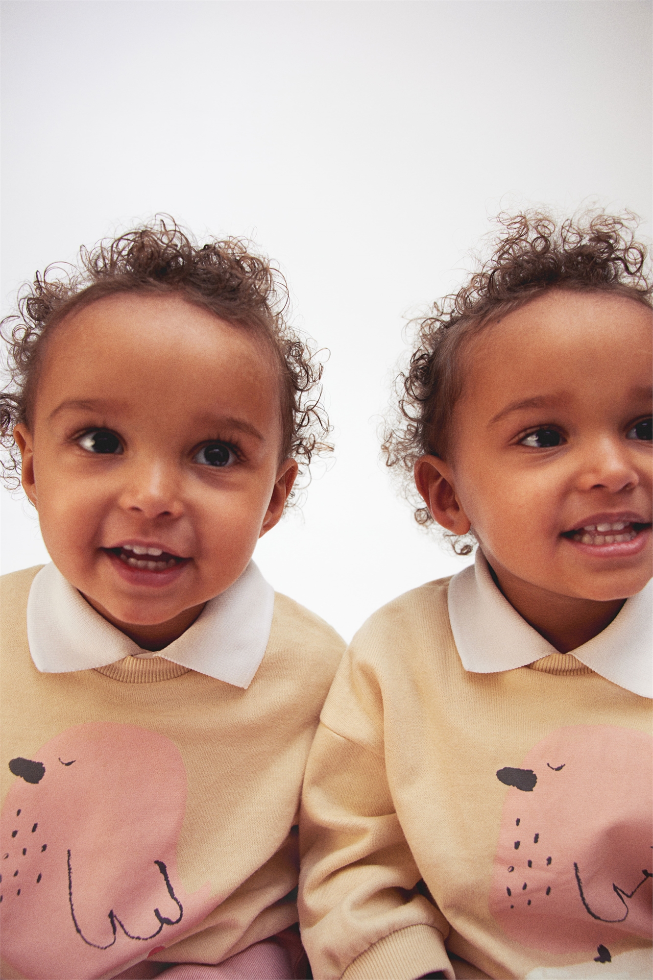 Топ из принтованной толстовки с мягкой ворсистой внутренней стороной. Круглый вырез с ребристой отделкой, застежки с одной стороны (кроме размеров 2-4Y), спущенные плечи и длинные рукава. Ребристые манжеты и подол.