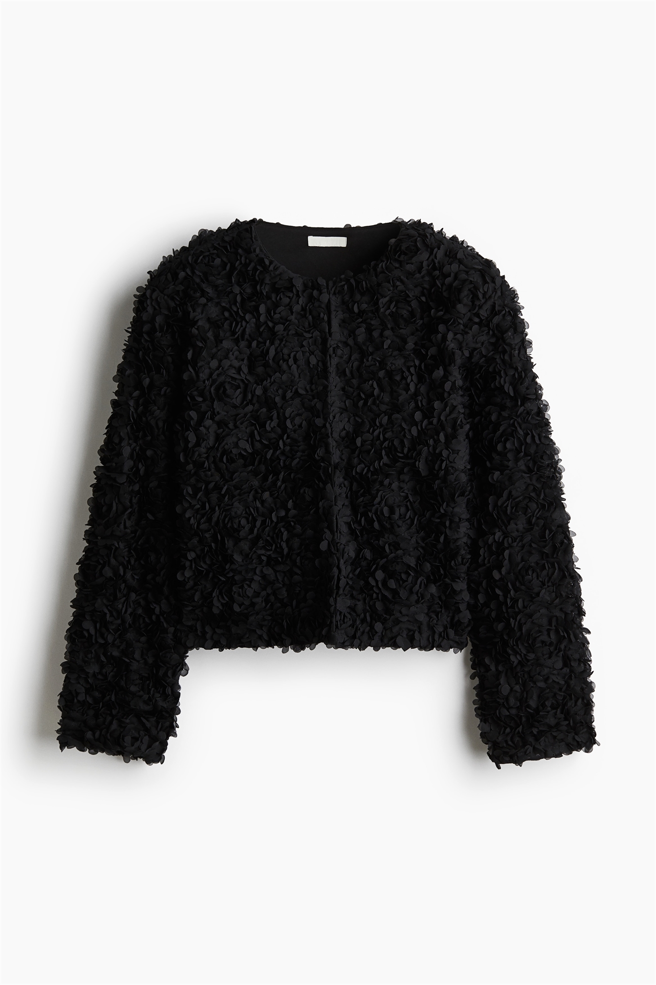 Свободный жакет из аппликационной ткани с круглым вырезом, потайными застежками-крючками спереди и подплечниками для придания силуэту четкости. Подкладка из джерси.