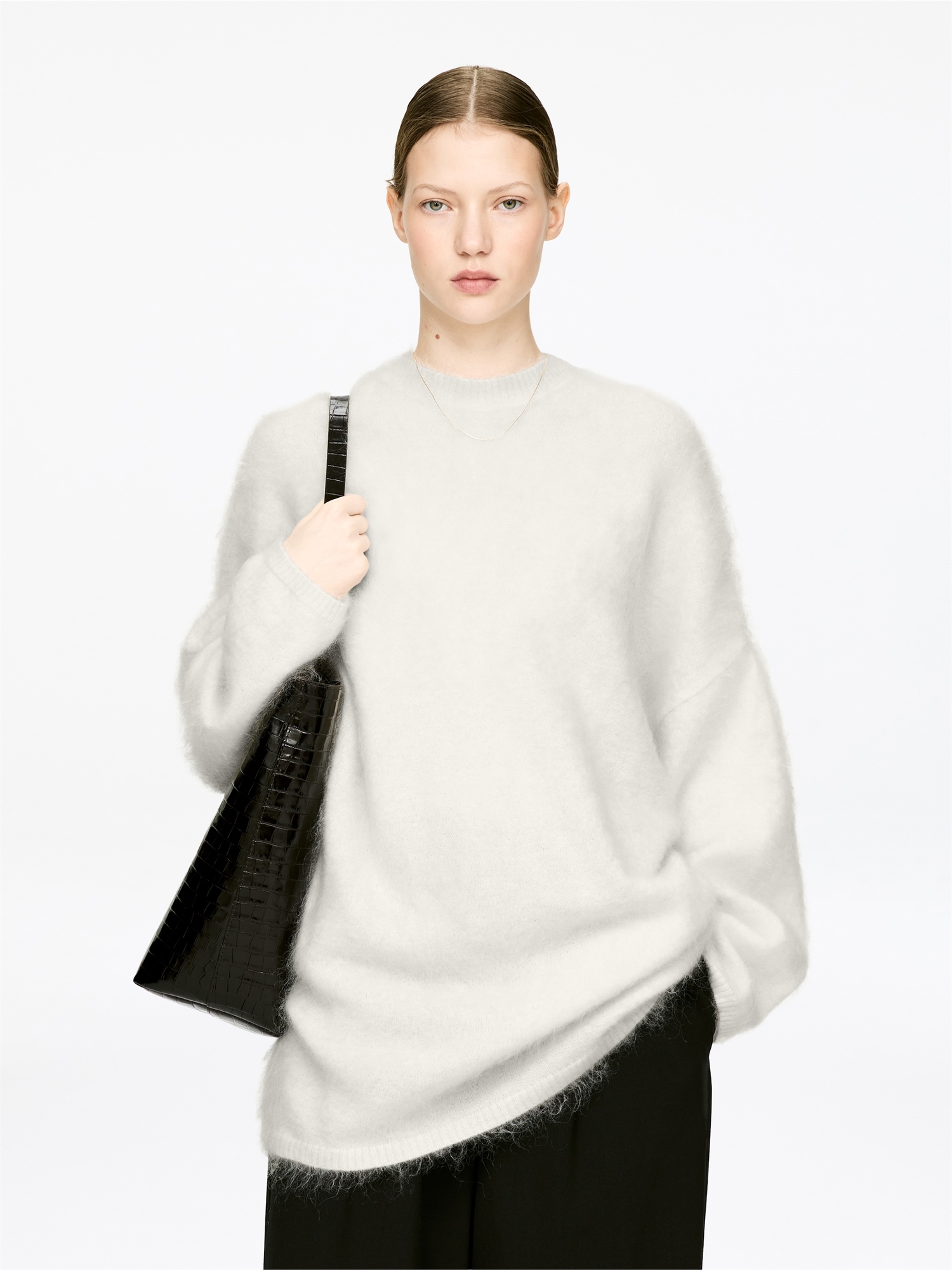 Длинный джемпер из смеси шерсти и мохера. Джемпер гладкой вязки, с вырезом горловины и завышенной посадкой. Этот джемпер содержит 45% мохера RMS и 17% шерсти RWS (TE-00047206). Продукция, сертифицированная по стандартам Responsible Wool Standard (RWS) и Responsible Mohair Standard (RMS), содержит шерсть и мохер с ферм, прошедших независимую сертификацию на соответствие требованиям по благополучию животных и землепользованию.