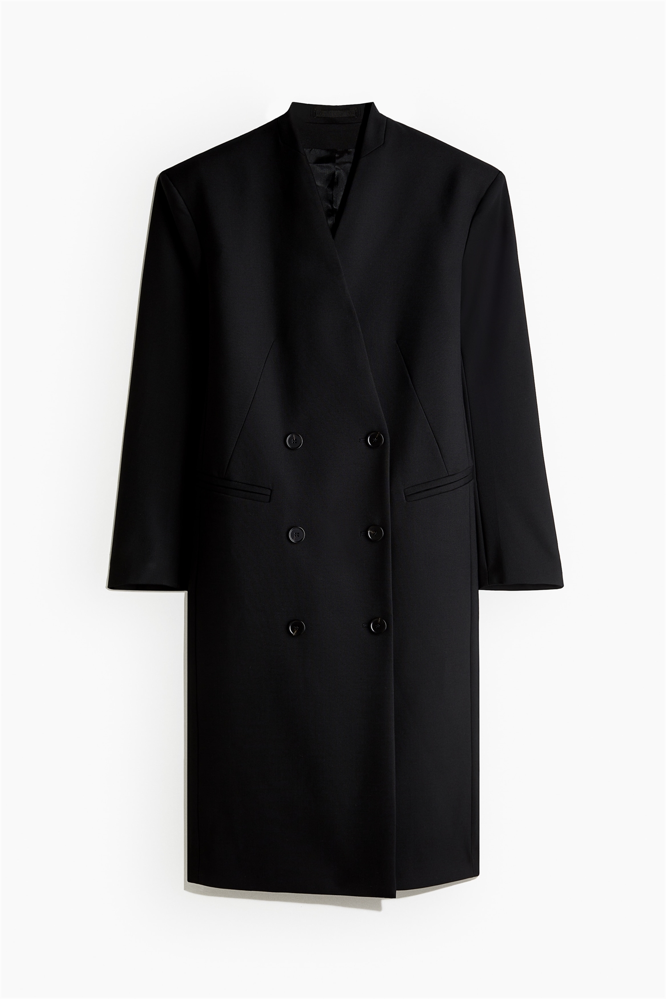 Коллекция Studio Collection. Двубортное пальто-блейзер длиной до колен из шерстяной смеси. Вырез без лацканов украшен декоративной строчкой, имитирующей воротник. Пуговицы спереди и манжеты на пуговицах. Прорезные передние карманы и прорезной внутренний карман. Сильные подплечники и заниженная талия создают смелый силуэт. Высокий разрез сзади. Подкладка из вискозы.