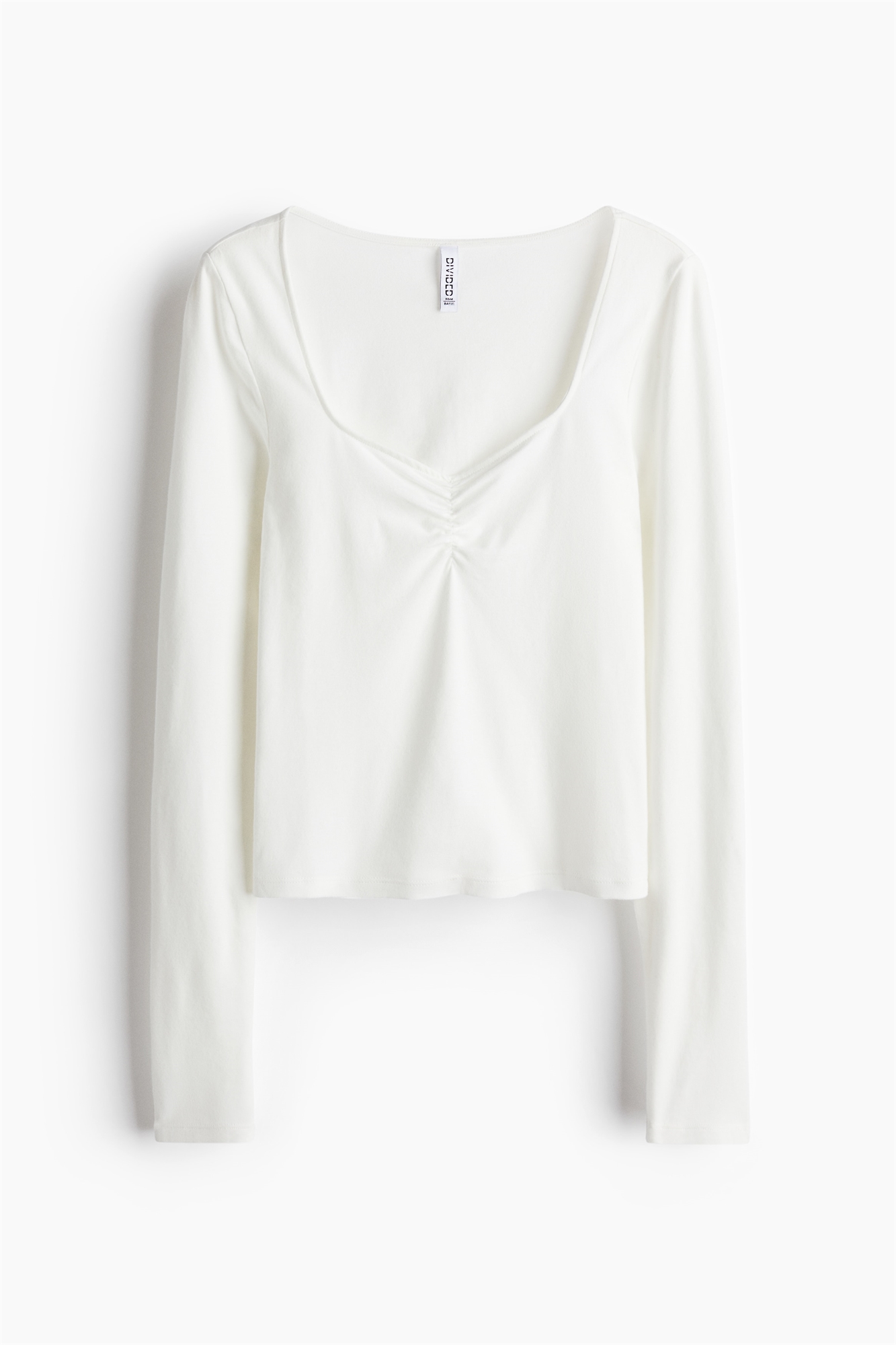 Короткая, облегающая фигуру рубашка с длинными рукавами из мягкого хлопкового джерси. С вырезом в форме сердца, коротким сборчатым швом спереди и прямым подолом.