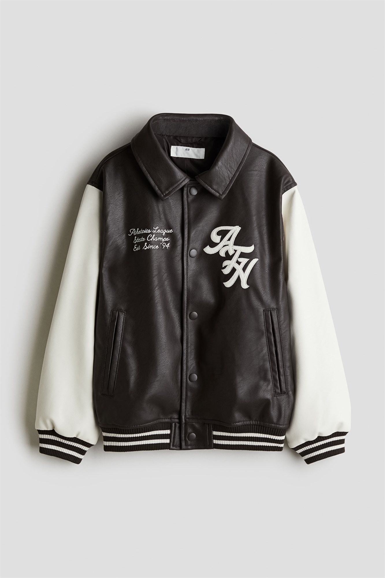 Негабаритная бейсбольная куртка из ткани с покрытием, воротник и вышитые детали спереди. Застежки на кнопках спереди, втачные передние карманы, манжеты и подол в рубчик. На подкладке.