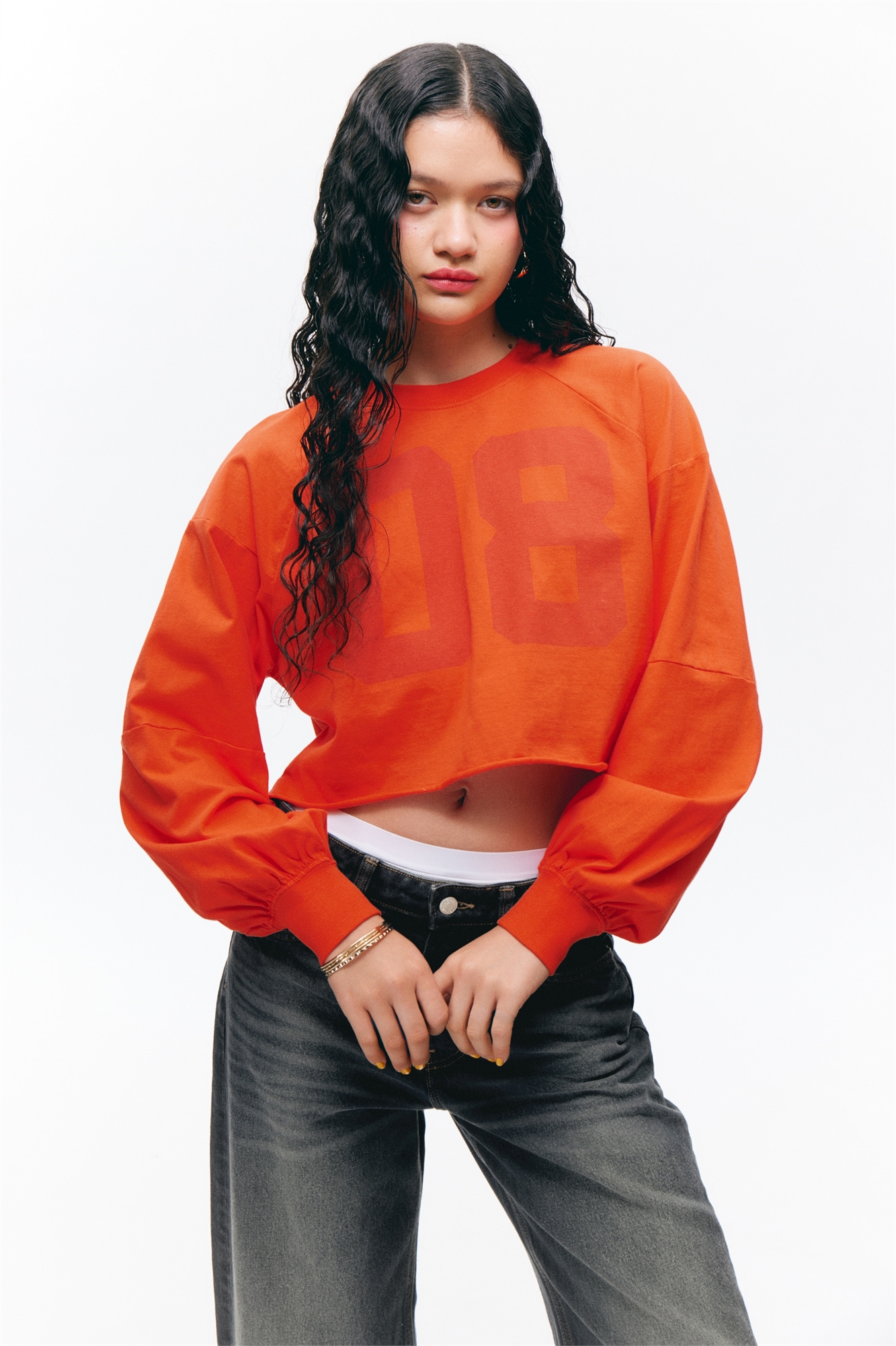 Обрезанная футболка с длинными рукавами свободного кроя. Круглый ребристый вырез, спущенные плечи, ребристые манжеты и необработанный подол. Свободный крой. Обрезанная длина. Круглый вырез. С длинными рукавами. Спущенные плечи. Ребристые манжеты. Необработанная линия подола.