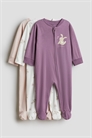 Спальные костюмы из мягкого хлопкового джерси с застежкой-молнией спереди, которая продолжается по одной ноге, с защитой подбородка от натирания. Длинные рукава с манжетами и полные ступни с эластичной вставкой сзади и противоскользящими протекторами (кроме размеров 2-6M).