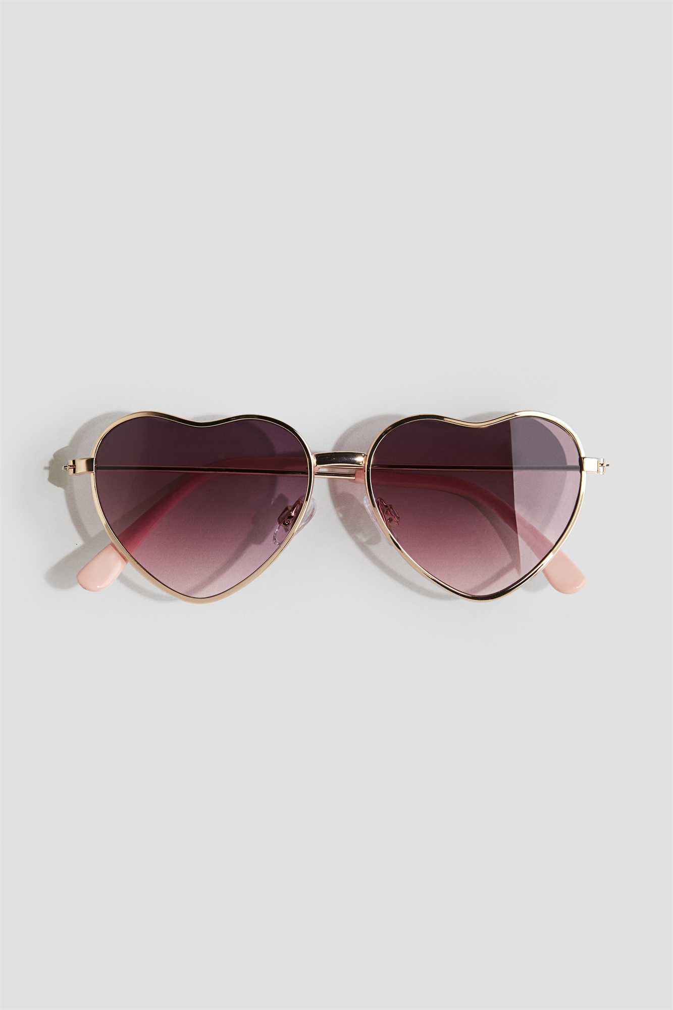 Солнцезащитные очки в форме сердца с тонкой металлической оправой и боковыми дужками из металла и пластика. Регулируемые носовые дужки и тонированные пластиковые линзы с УФ-защитой.